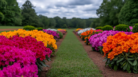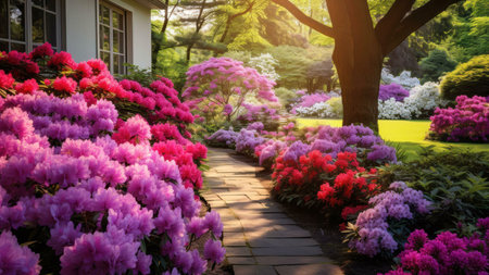 A beautiful garden path lined with blooming rhododendrons in shades of pink, purple and red. The sunlight creates a warm glow on the path, highlighting the vibrant colors of the flowers.