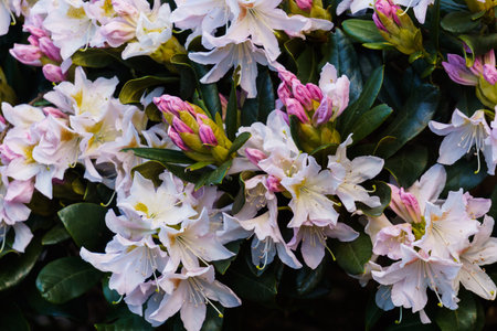 Beautiful White-pink Rhododendron buds open in spring in a park
