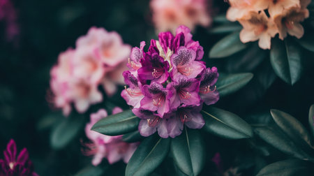 Explore a stunning arrangement of vibrant pink and purple rhododendron flowers surrounded by lush green leaves, showcasing the beauty of nature in soft natural light.
