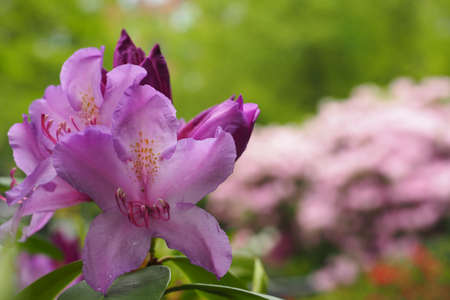 Blooming pink purple rhododendron in a botanical garden in spring. Background