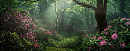 A tranquil forest with blooming rhododendrons and soft, diffused light.