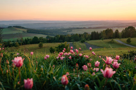 Hill with blooming pink flowers landscape photo. Beautiful nature scenery photography with sunlight