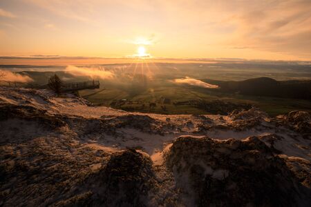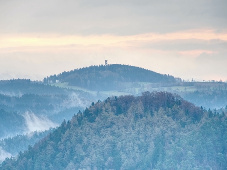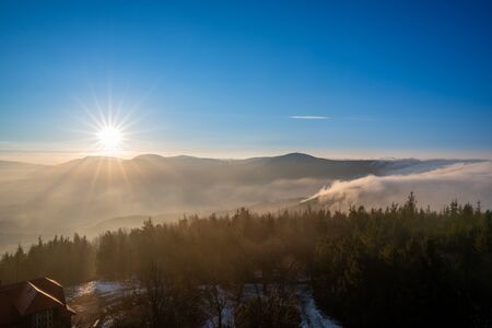 Sunrise and Inversion at Jested mountain close town Liberec, Czech republic, snow and winter and view of funicular.