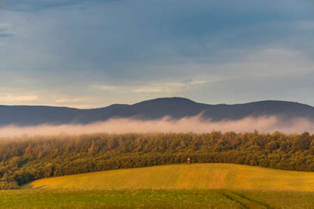 krasna czech landscape in mountains at sunrise with fog in valley at the turn of winter and spring, czech Beskydy