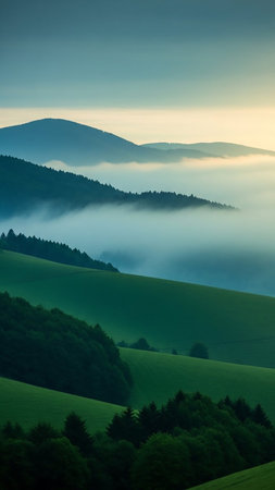 view of rolling hills and a forest covered in mist, capturing the peaceful beauty of a morning in nature.