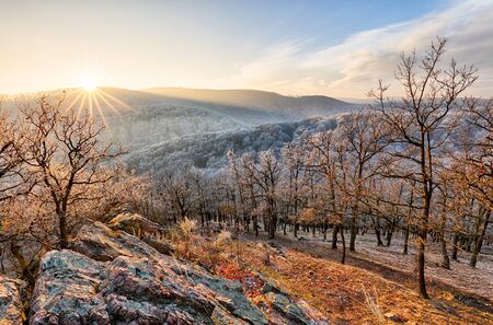 Exposed rocky mountain and sunset in the background, hoarfrost on meadows bellow