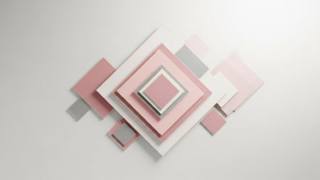 This image features an abstract geometric composition with various shapes in shades of pink, gray, and white. The arrangement creates a sense of depth and complexity with overlapping squares and rectangles. The design is minimalistic yet striking, emphasizing the interplay of colors and forms.