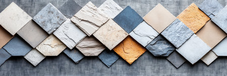 Various gray concrete tiles with distinct textures are arranged in a geometric pattern, showing a modern and minimalist aesthetic suitable for interior design or architectural purposes.
