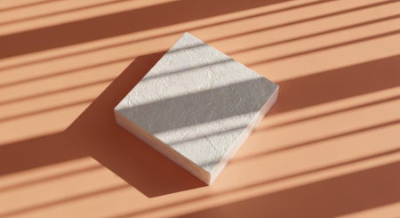 A light gray geometric stone rests on a warm terracotta surface with striped shadows.