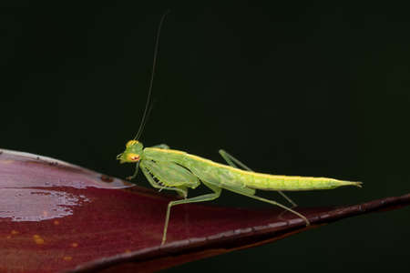 Photo of green Translucent mantis (Tripidomantis tenera) Iridopterygidae sitting on an ornamental plant leaf