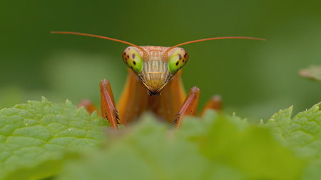 A detailed macro shot of a praying mantis on a vibrant green leaf. Its large eyes and predatory stance create an intense and fascinating subject.