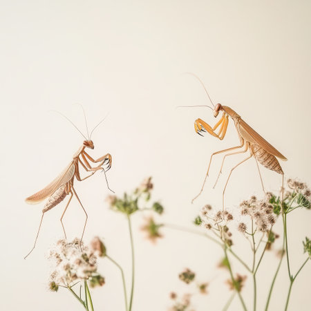 Two praying mantises interact gracefully on a cluster of delicate flowers in a serene outdoor setting during daylight.