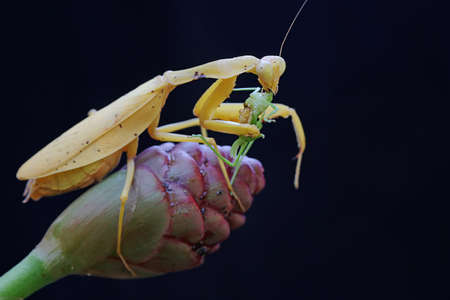 A yellow praying mantis is looking for prey in a wildflower on a black background. This insect has the scientific name Hierodula sp.