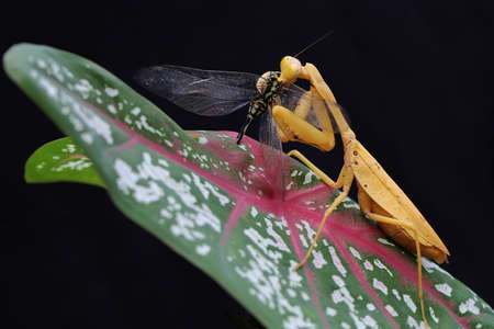 A yellow praying mantis is preying a wasp in a wildflower on a black background. This insect has the scientific name Hierodula sp.