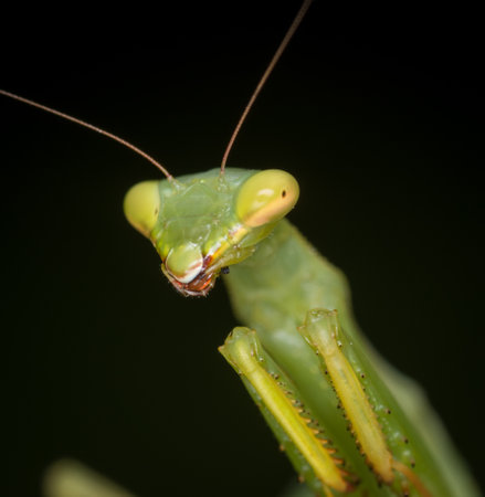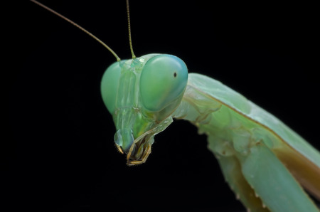 Portrait of an ordinary green mantis on a black background.