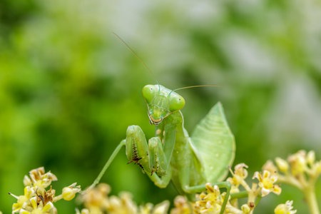 A vibrant green mantis is prominently displayed against a blurred green background showcasing its distinctive features and intricate details.