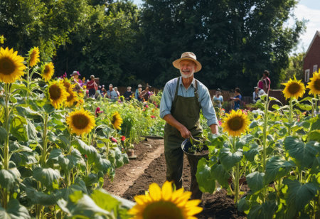 A gardener tends to a sunflower field, with bright blooms surrounding him. Agriculture and care for nature shine through.