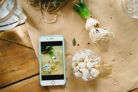 hyacinth on the table, a vase with white pebbles and a phone with a photo