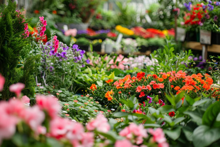 An array of colorful flowers and lush greenery lines a tranquil garden pathway. This serene nursery showcases nature's palette in full bloom