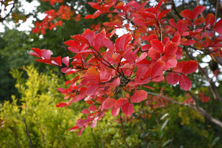 Bright autumn forest with red and orange leaves of smoke tree