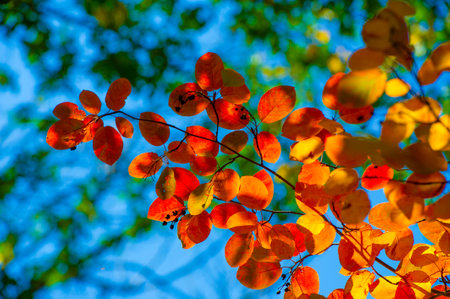 Beautiful tree with bright red and orange leaves. Brunches of wild European smoketree, Cotinus coggygria bush. Nature wallpaper with blurred bokeh lights, poster for home and office. Copy space.