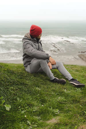 male tourist in a red hat and backpack, shot at a wide angle against the backdrop of the sea from the water level in winter in retro style.