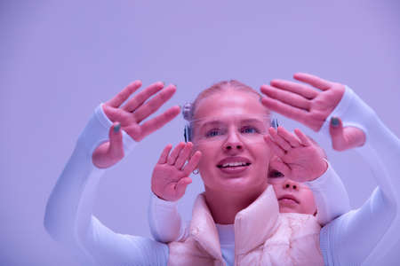 A young woman with her little daughter in a white high-tech clothes wearing smart glasses and pressing by hands up against a holographic screen