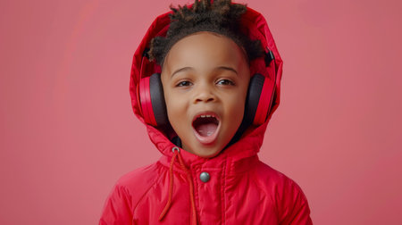 Adorable little girl enjoys music with red headphones, winter jacket, isolated on pink