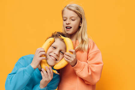 funny, cute children, a boy and a girl stand on a blue background in bright clothes and holding bananas in their hands are fooling around, connecting fruits in the shape of a circle