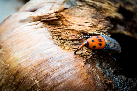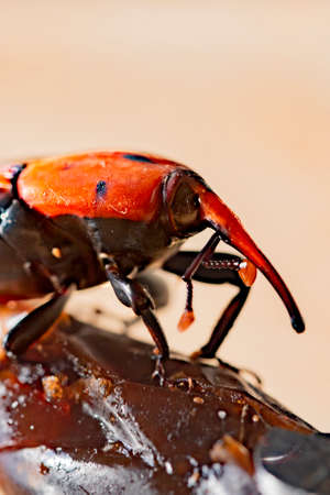 Rhynchophorus ferrugineus asian sago palm weevil beetle of large size and red color on reddish background and perched on a branch light by flash