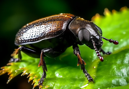 Black beetle perched on vibrant leaves, showcasing intricate details and textures. Nature and entomology concept with green background.