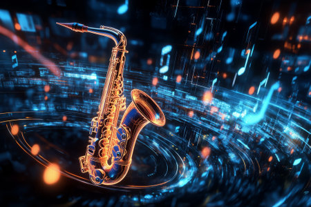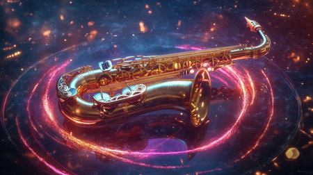 A surreal 3D abstract background featuring a floating neon saxophone emitting glowing, pulsating sound waves. The deep bass notes create an intricate pattern of vibrant energy in a futuristic digital soundscape.