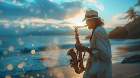 A talented jazz musician in a classic hat and stylish outfit playing the saxophone with passion. This image captures the essence of jazz culture, soul, and musical expression.