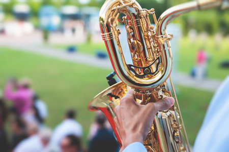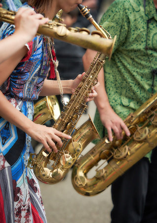 Boys Band saxophone section at event , jazz player male playing on Saxophone, music instrument played by man saxophonist musician at folk classical . Alto sax hands Closeup banner