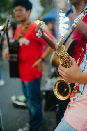Unidentified musician plays the saxophone at the annual street festival in Bangkok, Thailand.