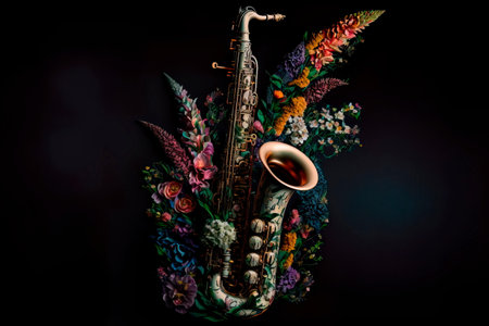 Saxophone in flowers, isolated on black, creative concept. Generative AI