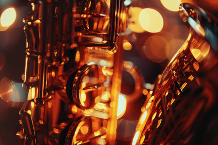 Close-up of a saxophone against bokeh background. Jazz night on a blues club ads template, copy space. Saxophone basking in the glow of soft light orbs.