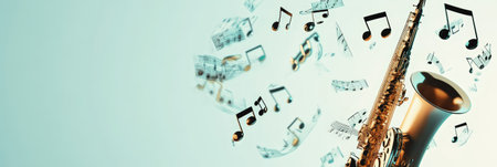 Golden saxophone levitating on a light green background, surrounded by floating musical notes and sheet music fragments, creating a dreamy and musical atmosphere