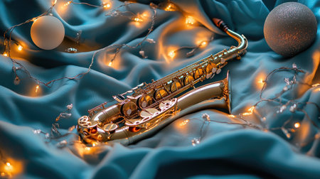 A saxophone lying on musical notes, surrounded by twinkling lights and festive decorations. The background is a soft blue with hints of gold, creating an atmosphere that evokes the joyful spirit of Christmas music. --chaos 30 --ar 16:9 --v 6.1 Job ID: d8aefaf8-460e-42aa-91b4-d74071862c49