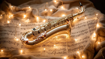 A saxophone with musical notes and Christmas lights floating around it, creating an enchanting atmosphere. The background is filled with sheet music, adding to the festive vibe of Christmas. --chaos 30 --ar 16:9 --v 6.1 Job ID: c32db3cd-3164-4f6f-857a-c77f76e4a098