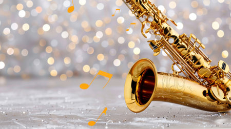 A stunning saxophone rests on a glittering surface, illuminated by vibrant bokeh lights and floating musical notes, perfect for music-themed designs.