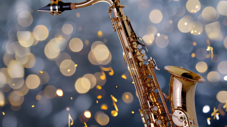 A stunning gold saxophone stands prominently against a shimmering bokeh background, adorned with floating musical notes, perfect for creative projects.