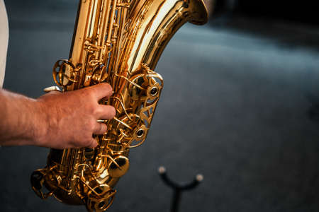 Musical instruments,Saxophone Player hands Saxophonist playing jazz music. Alto sax musical instrument closeup
