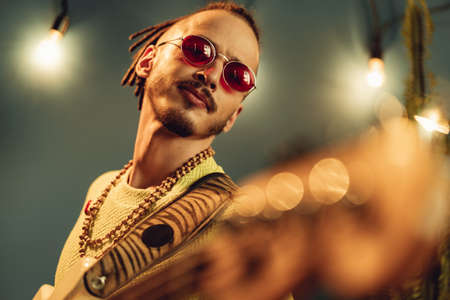 abilities for music.afro guy with mucial skills. madness, close up photo. copy space.