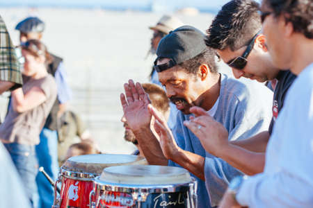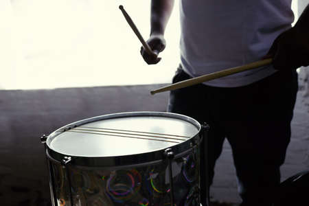 Played by blurred non recognizable percussionists musician. Fast hands playing on the drum. Authentic closeup musical instrument.