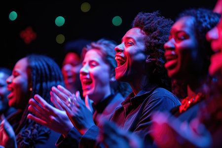A diverse group of choir members passionately sings together under warm stage lights, capturing the essence of unity and emotion in a vibrant musical performance.