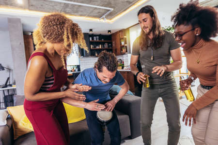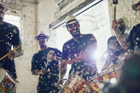 Its carnival time. Portrait of a group of musical performers playing drums together.