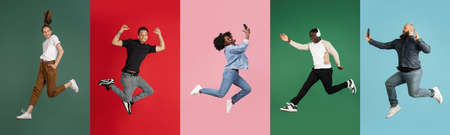 Collage made of multiethnic young people jumping together isolated on dark studio background in multicolored neon light with geometric luminescent shape cirlce