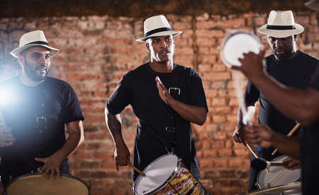 Their beats are on a whole new level. Shot of a group of musical performers playing drums together.