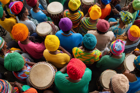 Black adults wearing traditional patterned clothing playing drums and clapping hands during Kwanzaa celebration, focusing on rhythmic hand movements and cultural expression